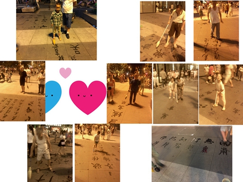 在万达广场西侧,有一群与众不同的人,他们用独特的休闲养身静心娱乐方法:用一桶水,用海绵制作成大水笔,在广场上行人道上写地书,切磋技巧,练字静心,有正楷体,草书体,及一些自创艺术体。有些年轻人根本认不到繁体字,在老前辈的指教下,以三人行必有吾师的精神风貌,来诠释绿色环保生态可持续发展休闲旋律。不但能弘扬中华文化艺术,而且也是让人与人沟通交流的好平台。它创导了绿色生态环保意识,也能使人更加进步和提高知识的文化含养!