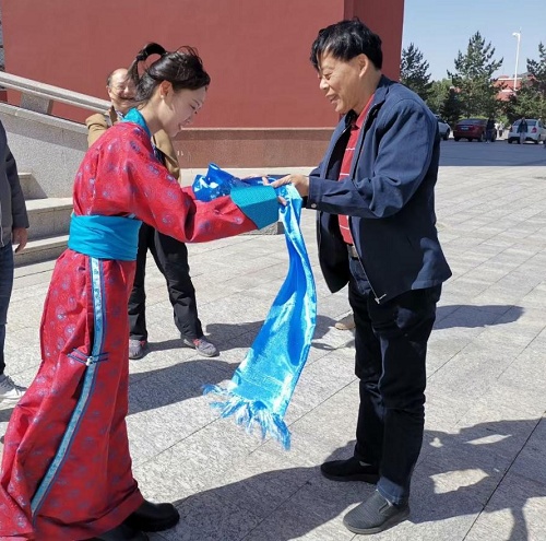 黄亚洲抵达呼和浩特,当地群众热情地献上哈达。